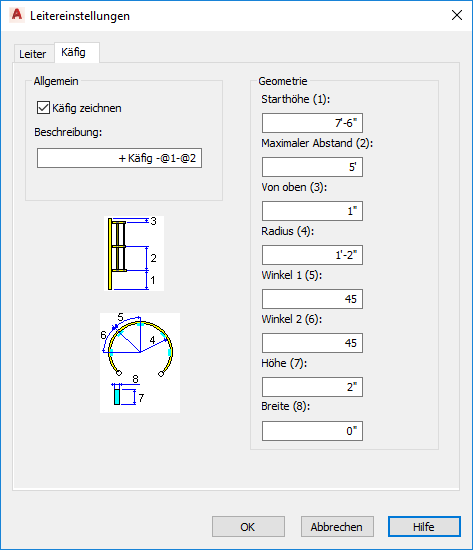 Bearbeitet die Geometrieeinstellungen für den Käfig. In Klammern angegebene numerische Werte entsprechen der beschrifteten Geometrie im Vorschaubild.