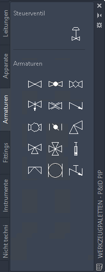 Die P&ID-Werkzeugpalette stellt eine visuelle Bibliothek der Symbole, Komponenten und Linien zur Verfügung, mit denen Sie Ihre P&ID-Zeichnungen erstellen und dokumentieren können.