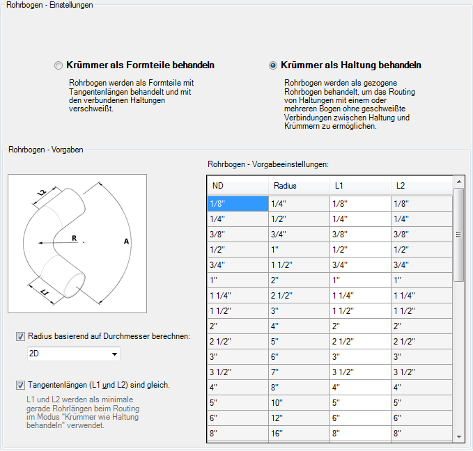 Wenn diese Option aktiviert ist, sind die geraden Rohrstücke vor (L1) und nach (L2) einem Krümmer gleich. Wenn diese Option deaktiviert ist, können Sie angeben L1 und L2 separat angeben.