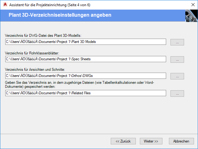 Assistent für die Projektkonfiguration Seite 4 - Einstellungen für Plant 3D-Verzeichnisse festlegen