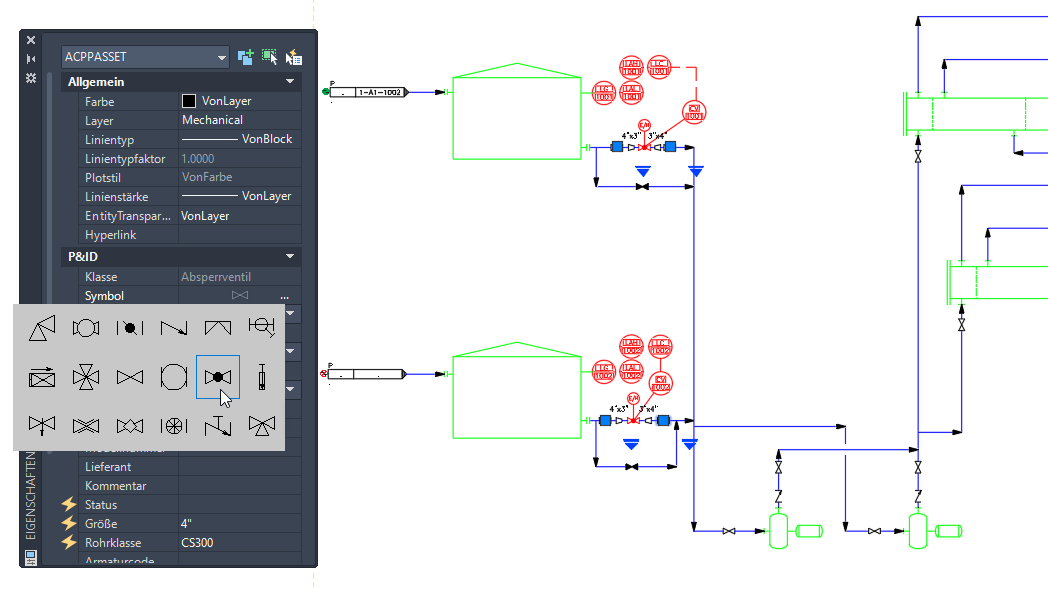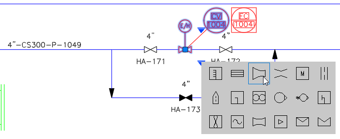 In einer P&ID-Zeichnung kann eine Komponente oder Leitung mithilfe des Ersetzungsgriffs oder der Eigenschaftenpalette durch eine andere Komponente oder Leitung ersetzt werden.