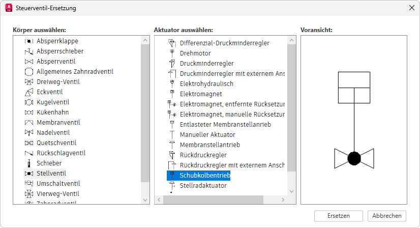 Während der Ersetzung eines oder mehrerer Steuerventile wird das Dialogfeld Steuerventil-Ersetzung geöffnet, in dem Sie zu einem anderen Ventilkörper, einem anderen Aktuator oder beidem wechseln können.