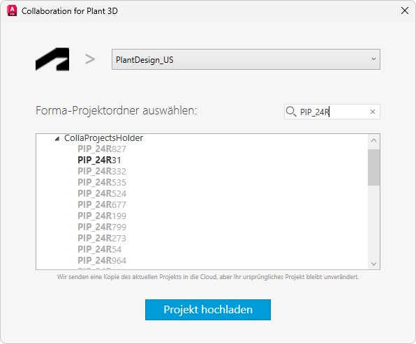 In einer Dropdown-Liste werden die Forma Data Management-Konten angezeigt, denen Sie angehören. Wählen Sie den Forma Data Management-Projektordner aus, in dem Sie arbeiten möchten.