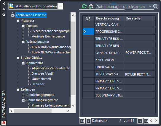 Im Datenmanager können Sie Zeichnungs- und Projektdaten anzeigen, ändern, importieren und exportieren sowie verschiedene Berichte erstellen.