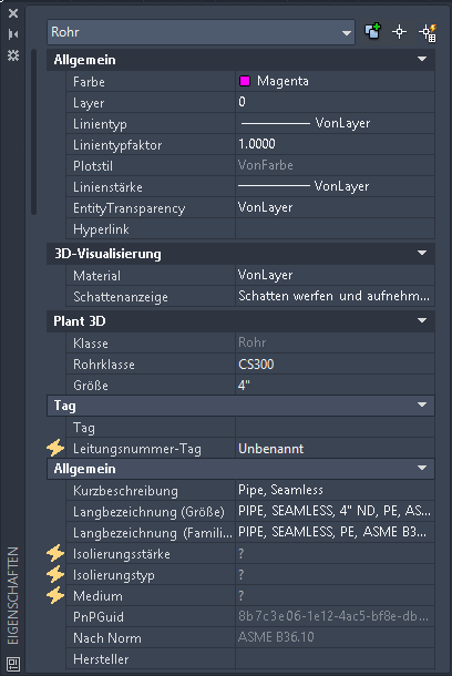 In der Eigenschaftenpalette können Sie die Daten eines Objekts ändern (beispielsweise die Rohrspezifikationen, einen Isoliertyp oder die Dicke, usw.). Über die Eigenschaftenpalette können Sie auch auf das Dialogfeld Bezeichnung zuweisen zugreifen, in dem Sie die Bezeichnungsinformationen ändern können.