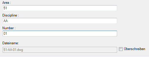 - Gibt den Namen der neuen Datei an. Wenn der ursprüngliche Dateiname mit einem Dateinamenformat erstellt wurde, z. B. einem Format, das Fläche, Disziplin und Nummer getrennt durch das Trennzeichen - kombiniert, verfügt das Dialogfeld DWG umbenennen über folgende Felder: