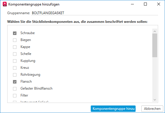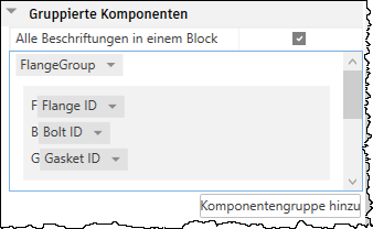 - In der Beschriftung für die Stücklisten-ID (Komponenten) können Sie die Komponentengruppe anpassen und folgende Aktionen ausführen: