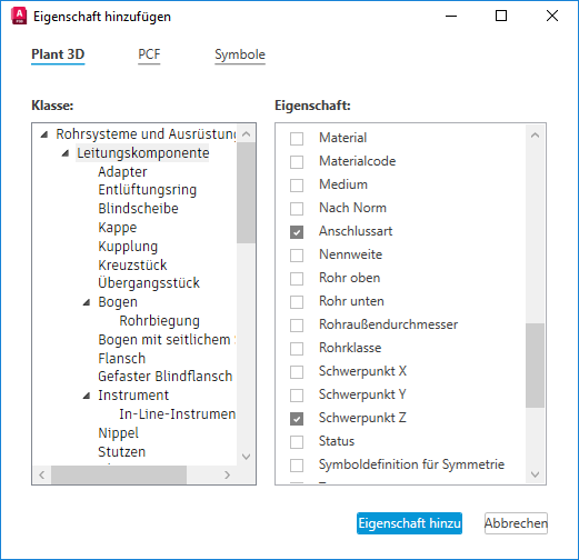 - Wählen Sie die Eigenschaften aus Plant 3D oder PCF aus.
