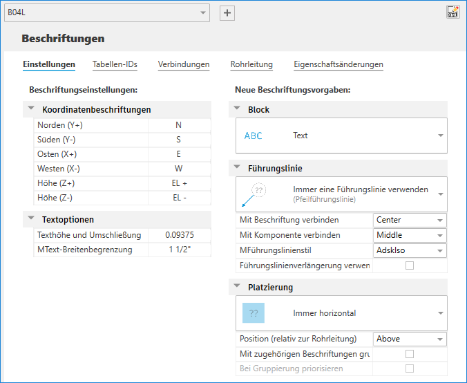 - Legen Sie die Vorgabeeinstellungen für neue Beschriftungen fest, z. B. Block, Führungslinienstile, Platzierung von Beschriftungen und andere zugehörige Einstellungen.