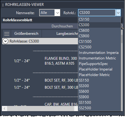Klicken Sie im Rohrklassen-Viewer in der Rohrklassenliste auf eine Rohrklasse (z. B. CS300).