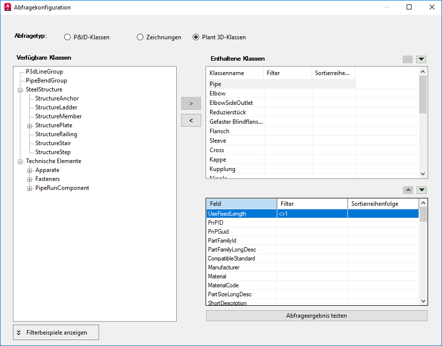 - Klicken Sie für den Abfragetyp auf P&ID-Klassen, Zeichnungen oder Plant 3D-Klassen.