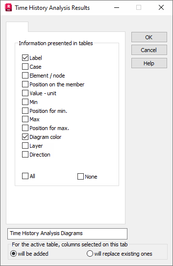 Right click in the table below the presented diagrams and select Columns to select quantities for time history analysis. The option is available only for time history analysis.