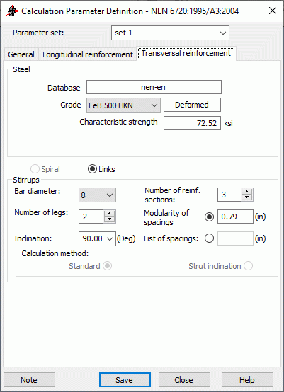 The Transversal reinforcement tab of the Definition of calculation parameters dialog box for NEN Code: