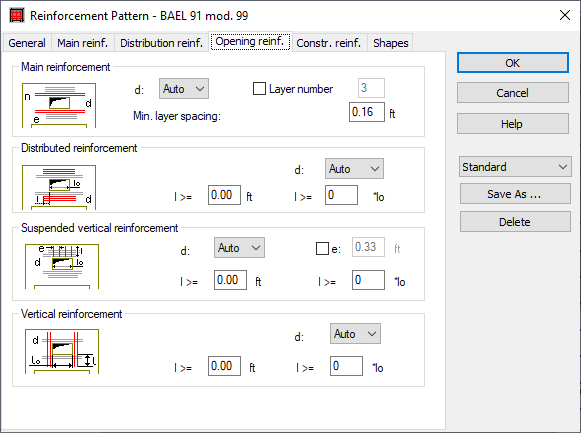 This reinforcement assures the proper suspension of the reinforcement applied above the opening in the zone = 0.75 of opening width. Additionally, it serves a structural function in cooperation with the upper reinforcement of the opening. The calculated area of reinforcement is independent of the area of distributed reinforcement of a deep beam. It is possible to shape the reinforcement within the opening by means of the options for defining the diameter and length of reinforcement arms.