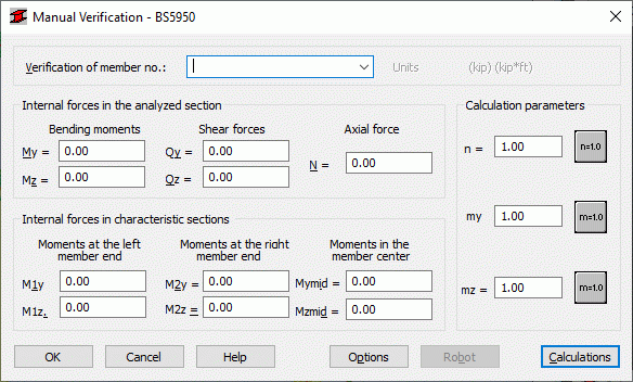 The Manual Verification dialog provides steel member verification against force values defined according to the British steel code BS5950. Access the option by clicking Design