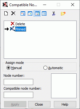 This dialog is used to define compatible nodes in a structure. It means that one defines shared nodes with respect to displacement or rotation for the selected degrees of freedom in the points where structure bars are connected (compatibility). Selected nodes are copied. Each node belongs to a different set of bars. All the degrees of freedom in a node, except those indicated by the user, are mutually independent.