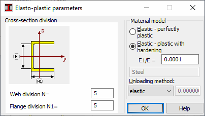 If the elastic-plastic model with hardening is selected, the E/E1 field becomes available in which you can enter a value for the plastic hardening parameter. This parameter is defined as a quotient of the material stiffness value (Young's modulus E) in the elastic range and the stiffness in the plastic range (the linear material model is assumed).
