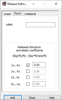 Elasticity coefficients are available only when the elastic releases option or the unilateral release option is selected. Elasticity coefficient values for linear releases are specified in the following units: