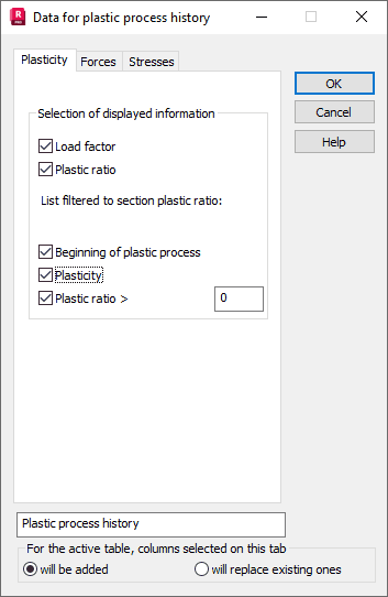 Select the Plasticity tab in the Table Columns dialog to select plasticity quantities for presentation.