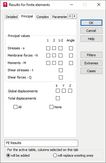 If you select s1, s2 or s12, it adds columns for stress values s1, s2 or s12, respectively, for individual planar FEs in the main coordinate system as selected during structure analysis.