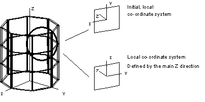 Typical situations are shown on the drawing below. All elements are laying on the surface of a cylinder. Initially, local x axes are parallel to the meridian. These axes will be redefined using the main direction pointed in the same direction as the global Z axis.