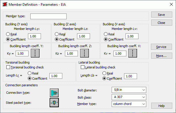 Once the Service button is clicked, an additional dialog is displayed, in which the member type parameters are defined (limit displacements, initial deflections).