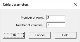 The Table parameters dialog box presented below allows you to determine the number of rows and columns that will constitute the table to be defined. The dialog box is opened by: