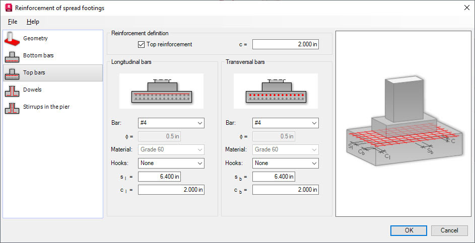 Zum Erstellen der oberen Bewehrung in einem Einzelfundament klicken Sie unter Bewehrungsdefinition auf Obere Bewehrung. Hier können Sie die Parameter der oberen Bewehrung definieren: