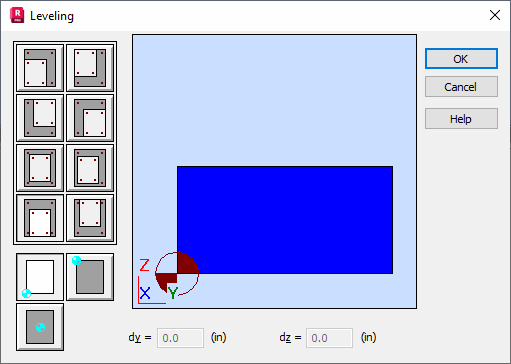 Once the segment is selected and the Leveling button is pressed, the Leveling dialog box will appear on the screen (see the figure below). It aids in setting the segment location by using characteristic section points (e.g. colinearity with regard to the right upper corner of the section). Otherwise, section leveling can be set by entering the segment displacements with regard to 'dy' and 'dz'. The leveling reference point can be set arbitrarily. The segment can be leveled in two directions: Y and Z. The 'dy' and 'dz' fields show the displacement increment for the characteristic points in relation to the reference point. Changing the reference point results in automatic recalculation of 'dz' by 'dy'. The section displayed in gray corresponds to the selected segment, while the yellow section stands for the adjoining segment (the reference segment for leveling).