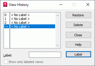 Views that result from zooming, translation, rotation, projection onto different planes, and the visualization of such structure attributes as: supports, sections, loads, and so on, are added consecutively to the list in the dialog and assigned successive numbers. To name a view, enter a label and click Label. The new name is added to the list of views. To return to the previous structure view, double click the view or select the view from the list and click Restore.