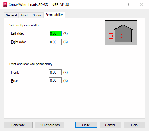Opening the Snow/Wind Load dialog and clicking the Permeability tab displays the following dialog.