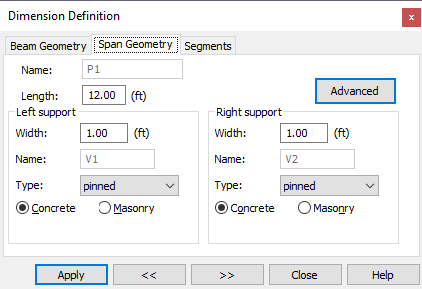 The Fix span length in axis option (the option is active for beams defined directly in the RC beam module) determines if a change of the support width has effect on the span length, if the length remains constant when the width changes.