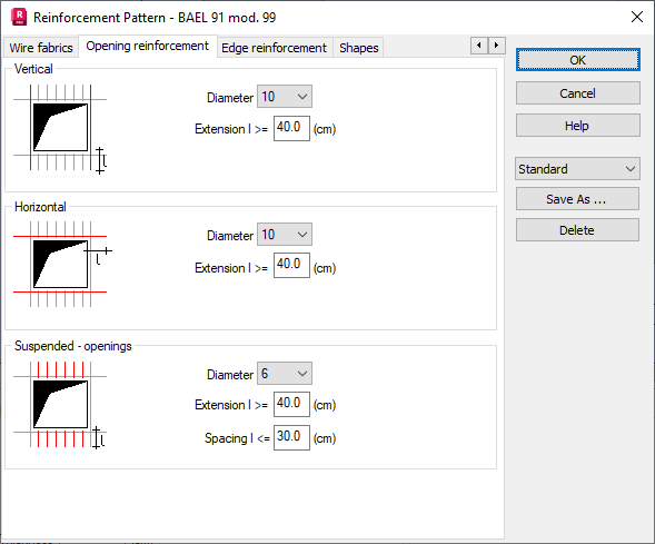 The Opening reinforcement tab allows you to define parameters of opening reinforcement for the BAEL code.