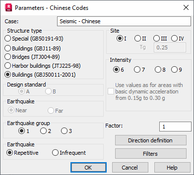 Parameters of a structure seismic analysis depend on a seismic code used during calculations of a structure influenced by seismic impact. Select seismic Chinese codes in the New Case Definition dialog or click Parameters in the Analysis Type dialog.