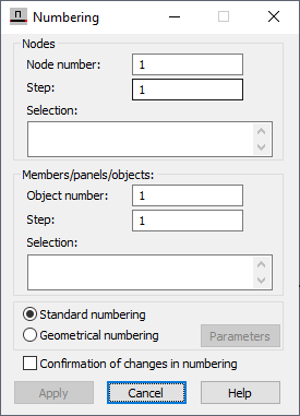 At the bottom of the dialog is the Confirmation of Changes in Numbering option. When selected, a change in the numbering of members, nodes, panels or objects is signaled by a warning message.