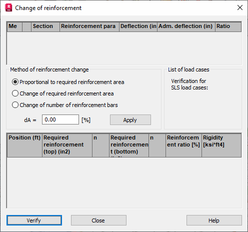 Click Reinforcement change on the RC Member Calculations: Report dialog to open the Change of reinforcement dialog. This enables semi-automatic correction of the calculated reinforcement in elements for which admissible deflection has been exceeded.