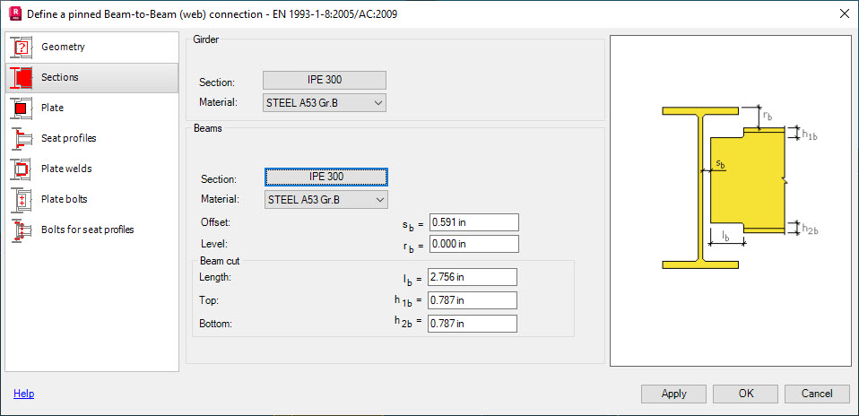 Verwenden Sie die Registerkarte Schnitte, um Profile für den Oberzug und den Balken in der Verbindung zu definieren.