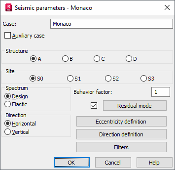 Parameters of a structure seismic analysis depend on a seismic code used during calculations of a structure influenced by seismic impact. Select Monaco seismic code in the New Case Definition dialog or click Parameters in the Analysis Type dialog.