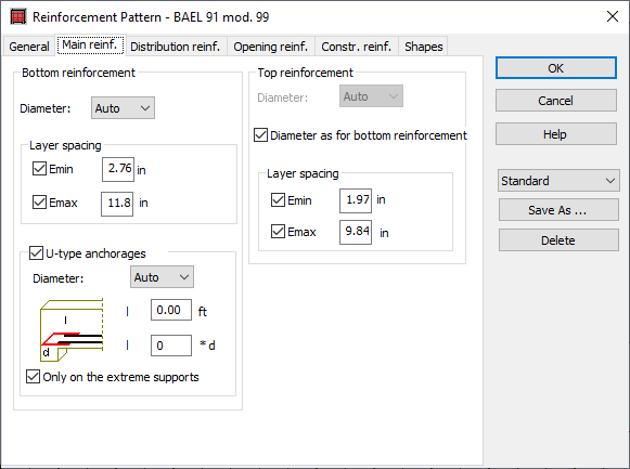 Bottom reinforcement - Determines the diameter of reinforcement, define the minimum and maximum spacing between reinforcement layers.