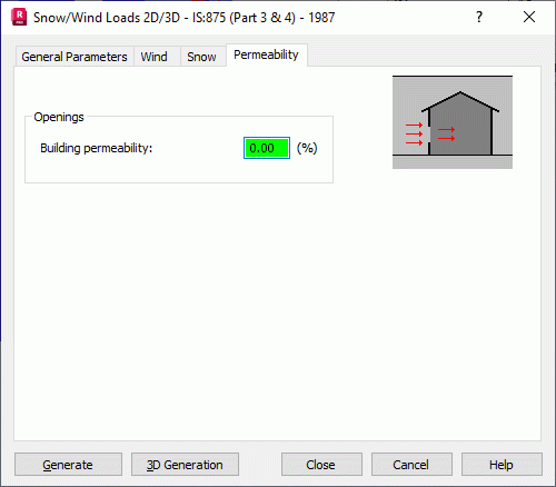 Opening the Snow/Wind Load dialog and clicking the Permeability tab displays the following dialog.