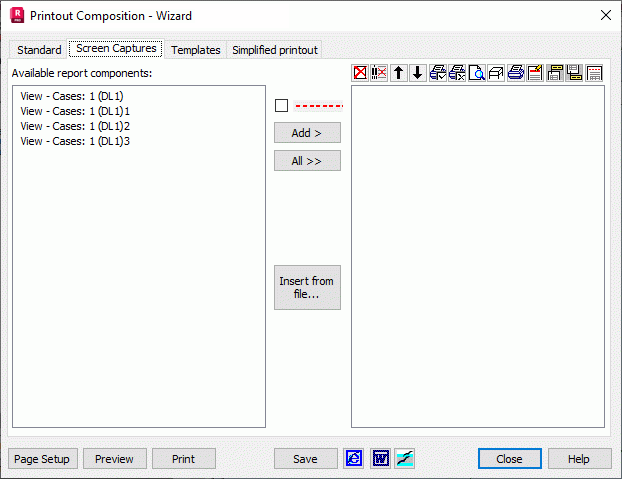 The right panel composes a complete printout that may contain all the objects specified in the left panel. To prepare the printout composition, move screen captures from the left to right panels using the All and Add buttons. All moves all of the available objects to the right. Add moves only selected (highlighted) objects.