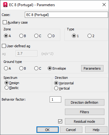 Parameters of a structure seismic analysis depend on a seismic code used during calculations of a structure influenced by seismic impact. Select seismic code EC 8 - Portugal (requirements adopted for Europe and presented in Eurocode 8) in the New Case Definition dialog or click Parameters in the Analysis Type dialog.