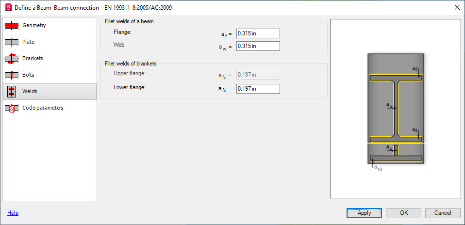 Verwenden Sie die Registerkarte Schweißnähte, um die Dicke der Schweißnähte, mit denen die Balken mit der Stirnplatte verbunden werden, und die Dicke der Schweißnähte zum Verbinden der Vouten festzulegen.