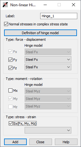 In the dialog, 3 non-linear hinge types are available: force-displacement, moment-rotation, and stress-strain. The stress-strain type is available after the Normal stresses in complex stress state option is selected. By default, all hinge types are cleared. For example, if the FY option is selected, the non-linear hinge models for that hinge type are available. Depending on the type of structure only some hinge types are available, similar to bar releases. The description in the Type: stress-strain field changes depending on the type of structure and the available degrees of freedom.