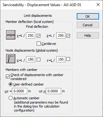 It is possible to define limit displacements (member deflection in the directions y and z, nodal displacements in the directions x and y) and additionally, to determine, whether a member is a cantilever while calculating member limit deflections.