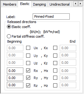 To define an elastic release, assign a label, select the degrees of freedom to be released at the beginning and the end of the member element. Also, you specify the following parameters: