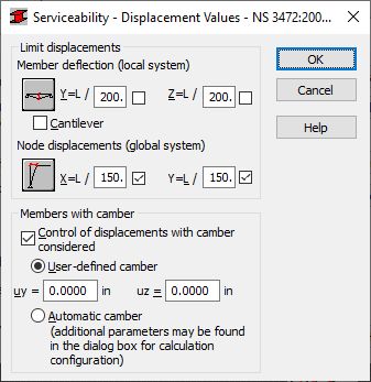 It is possible to define limit displacements (member deflections in the directions X and Y, node displacements in the directions X and Y) and, additionally, to decide - while determining the limit deflections of a member - whether the member is a cantilever. Options in the lower part of the dialog box allow defining parameters of a member with camber: