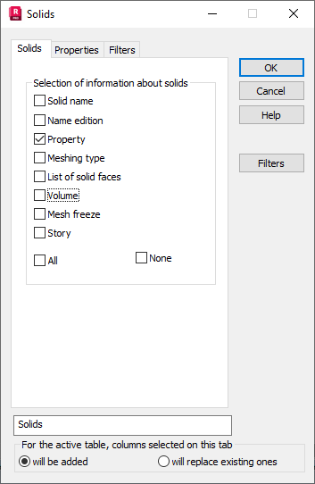 Select the Solids tab in the Columns dialog to select solid parameters for presentation.
