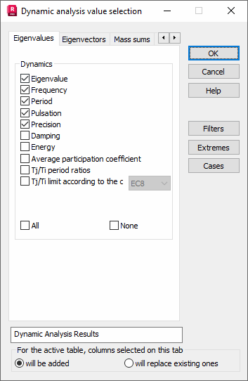 Select the Eigenvalues tab in the Table Columns dialog to select dynamic analysis quantities for presentation.