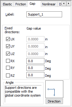 The definition of support with gap consists in indicating the support name, selecting the fixed or released degrees of freedom and indicating the values of the allowable displacement or rotation for the released directions. If the direction is fixed, the displacement is equal to zero.